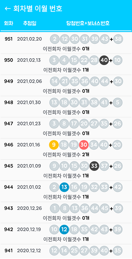 951회차에는 이월번호 출현이 없었습니다. 947회차, 948회차, 949회차에서는 이월번호가 출현하지 않았습니다. 950회차에는 949회차에 출현했던 40번이 출현하였습니다. 940회차 이하 정보는 개꿀로또 어플의 로또 분석 및 통계 > 회차별 이월번호 메뉴에서 확인 가능합니다.