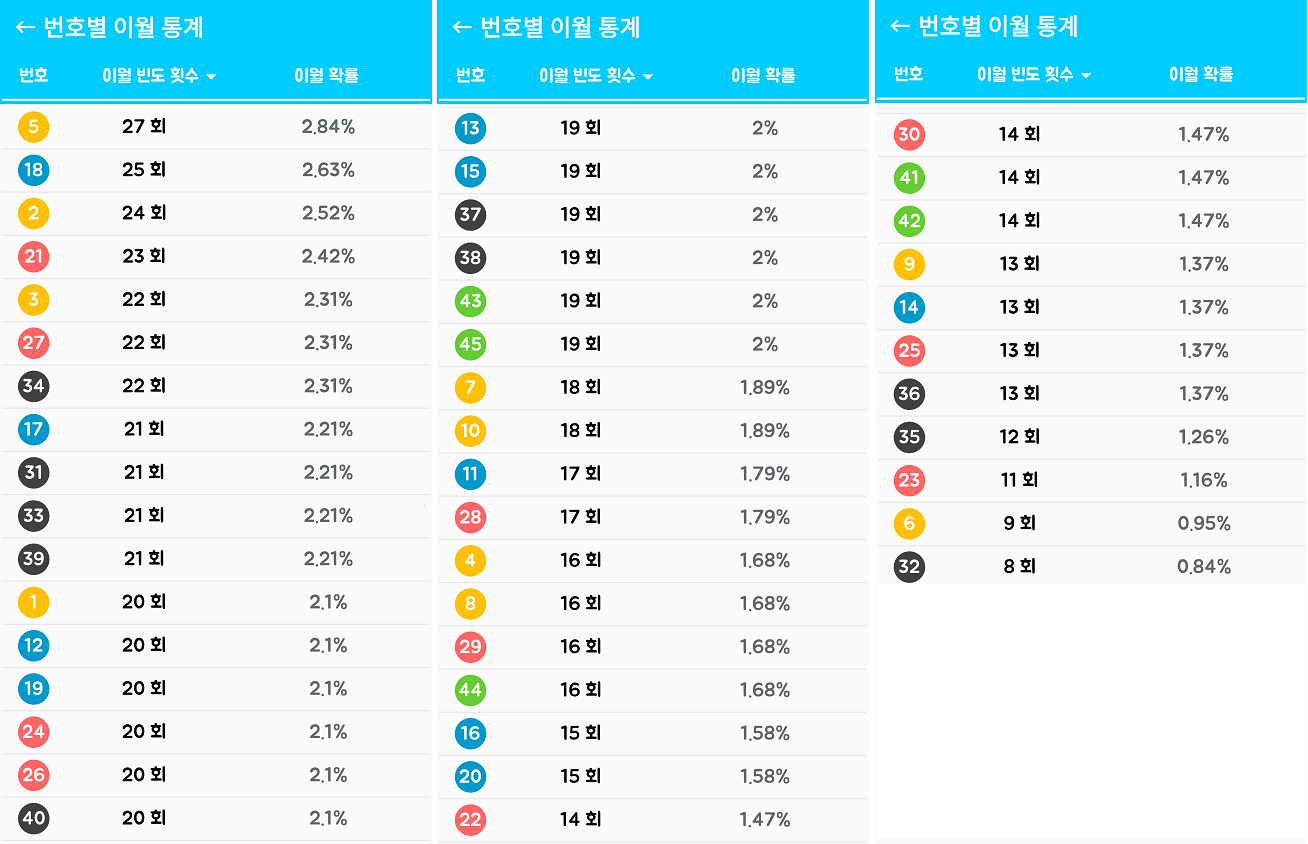 - 41~45번 번호대 에서는 미출현 번호가 없습니다.