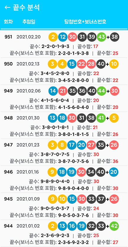 951회차 끝수는 2,2,0,1,9,3이며 끝수 합은 17입니다. 950회차의 끝수는 3,4,5,2,8,0입니다. 끝수합은 22입니다. 보너스 번호를 포함한 끝수합은 22입니다. 948회차 끝수는 3, 8, 0, 1, 8, 1입니다. 끝수합은 21입니다. 보너스 번호 포함시 끝수는 3, 8, 0, 1, 8, 1, 5이고 끝수합은 26입니다. 2주 연속 끝수가 3과 8과 0인 숫자가 출현하였습니다. 4주 연속 끝수가 0인 숫자가 출현하였습니다.