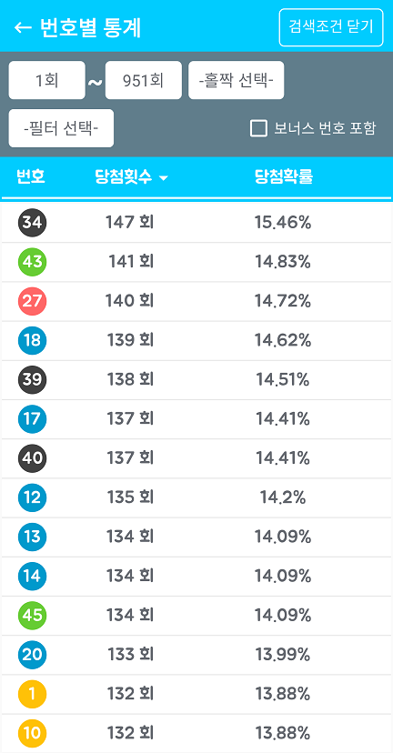 이번주 로또(lotto 645) 구입하셨나요? 952회 예상 당첨 번호 조합을 위해 로또 1회~951회까지의 데이터를 기반으로 분석하였습니다. 1등 당첨을 기원하며 개꿀로또앱의 로또 분석 및 통계 메뉴를 이용하시면 동일하게 이용할 수 있습니다.
