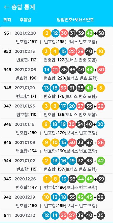 951회차 당첨번호 총합은 157이며 보너스 번호 포함시 195입니다. 950회차 당첨번호의 총합은 112입니다. 보너스 번호 포함시 총합은 122입니다. 949회차 당첨번호의 총합은 190입니다. 948회차 출현번호의 번호 총합은 171입니다.