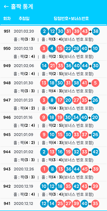 951회차 당첨번호의 홀짝비율은 3:3입니다. 950회차 당첨번호의 홀짝 비율은 2:4비율로 출현하였고, 949회차 역시 2:4 비율로 출현하였습니다.948회차에는 홀수와 짝수가 3:3비율로 출현하였습니다. 947회차에는 4:2의 비율로 홀수가 월등히 많이 출현하였습니다.
