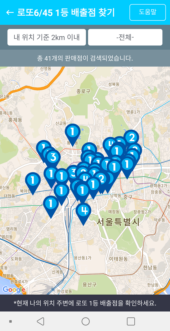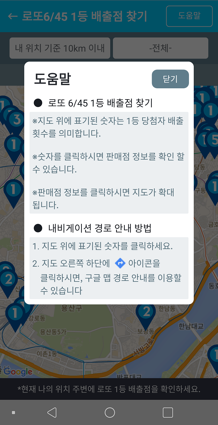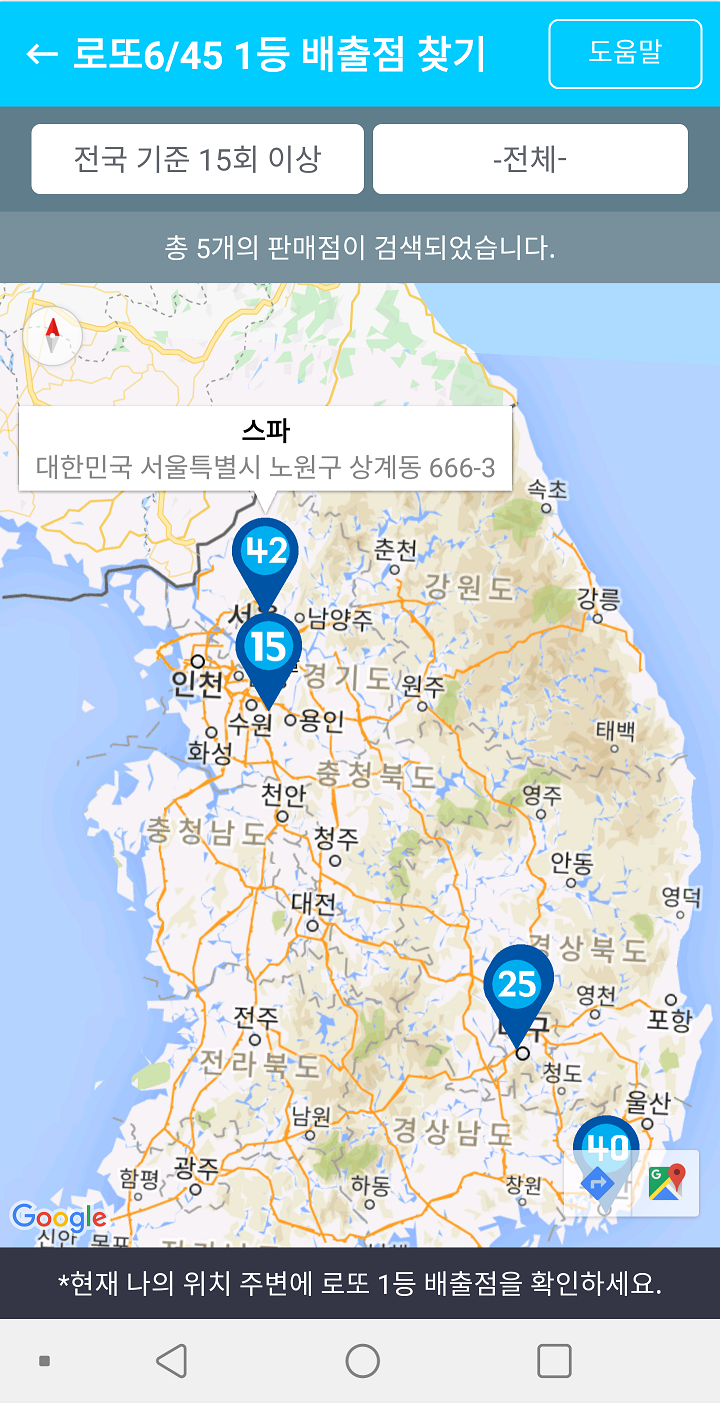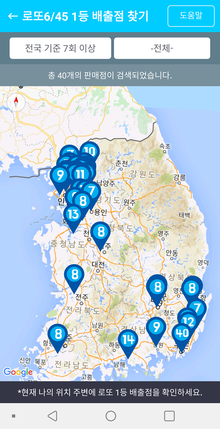 지도위에 마커으 숫자는 로또 1등 당첨 횟수를 의미합니다.