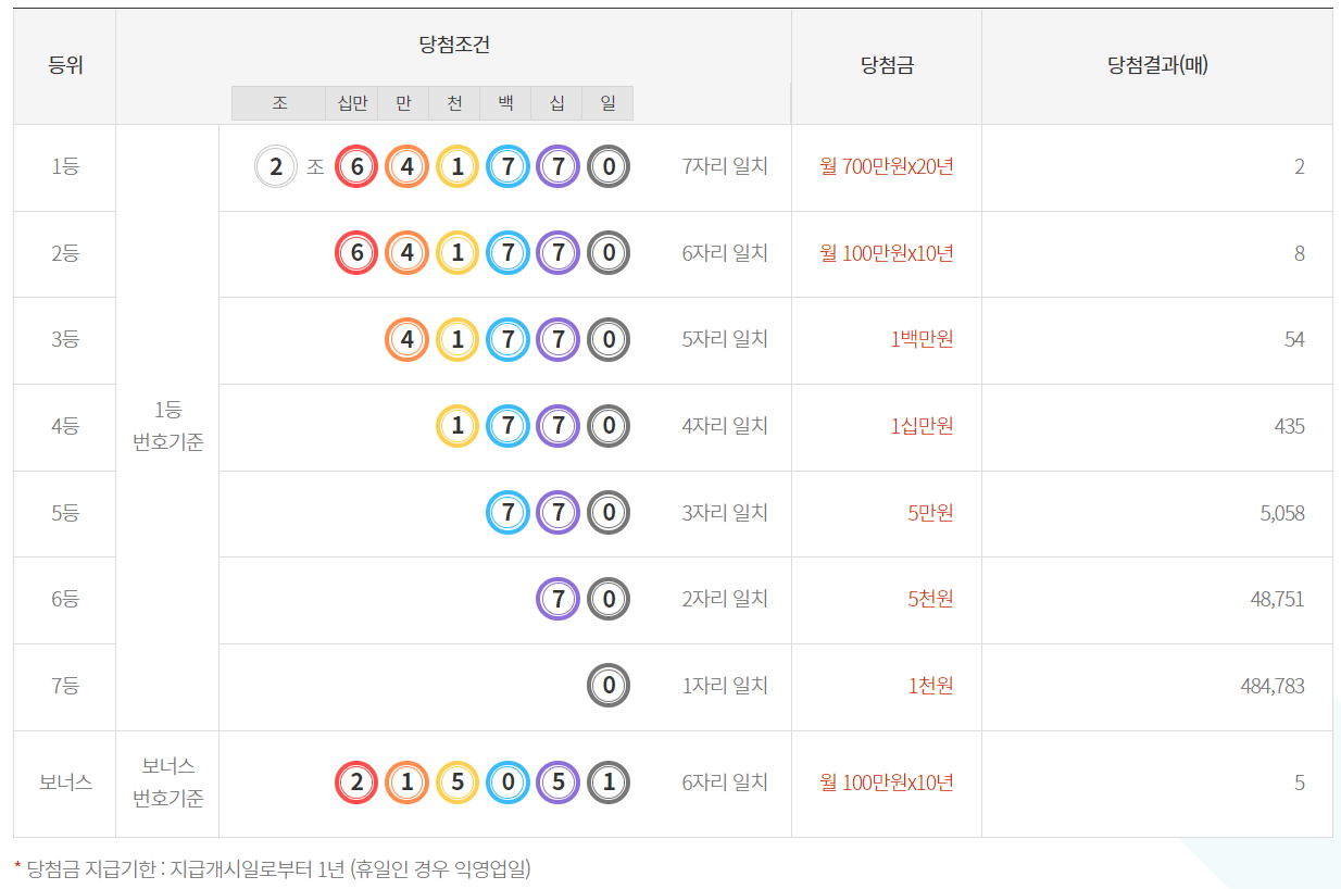- 연금복권 720+당첨금은 등수별로 중복되는 경우에도 모두 수령 가능하며, 지급 개시일로부터 1년이며, 휴일인 경우 익영업일입니다.
