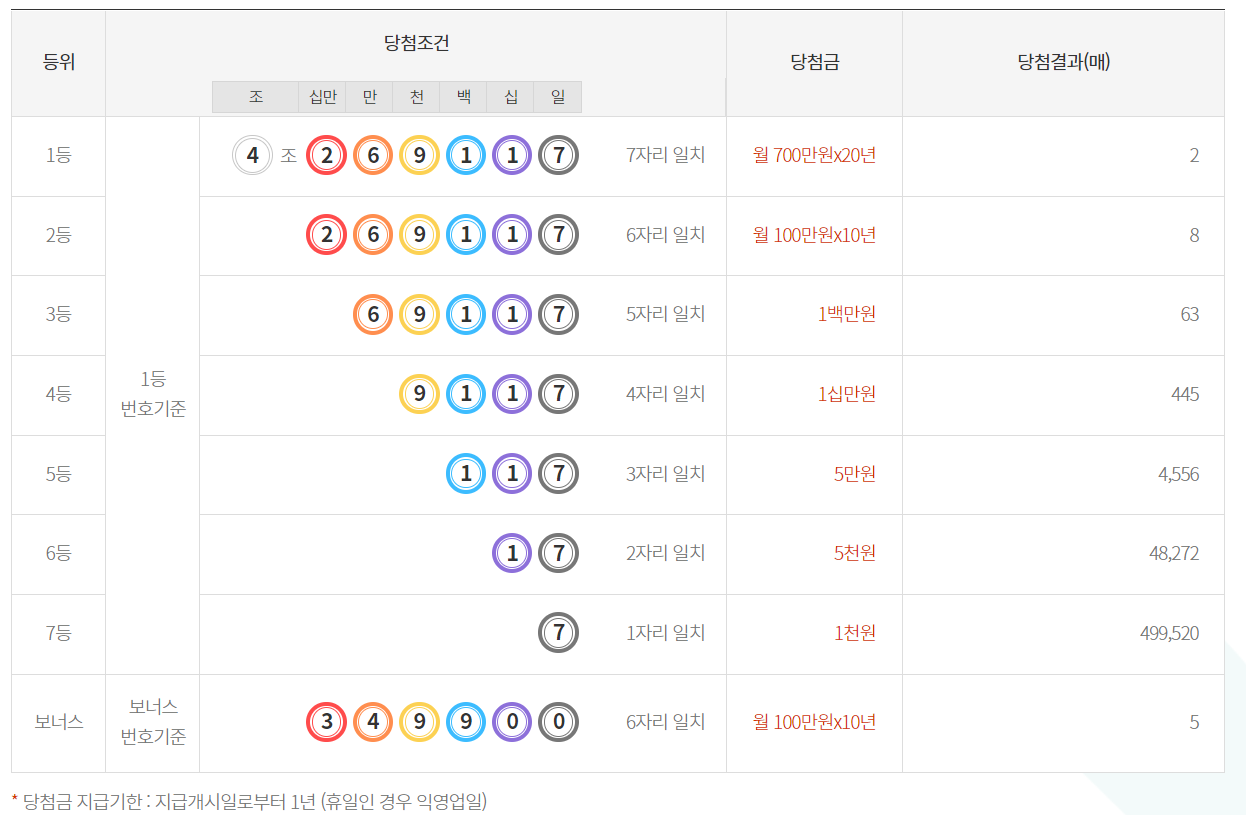 제 117회 연금복권 720 1등 당첨번호는 4조 269117번입니다.
