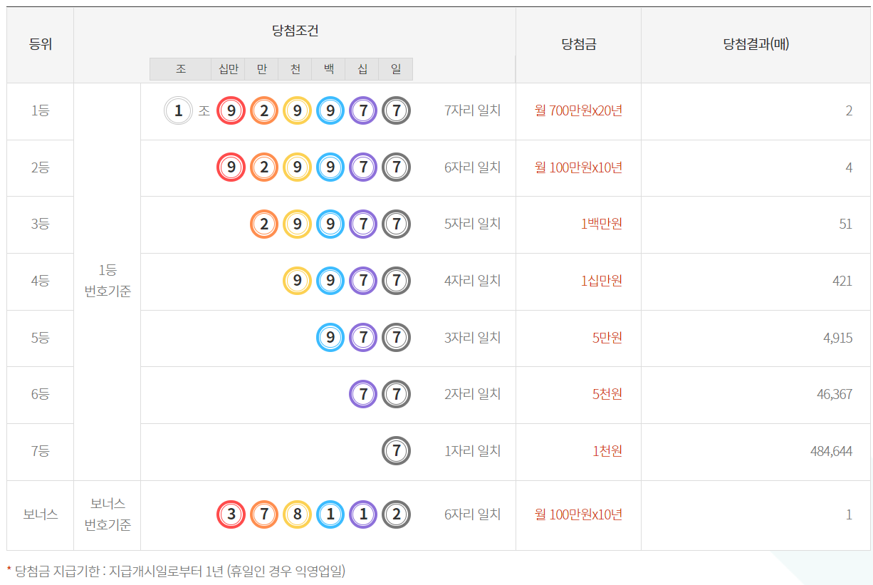 연금복권 1등 2등 3등 4등 5등 6등 7등 당첨 번호 확인