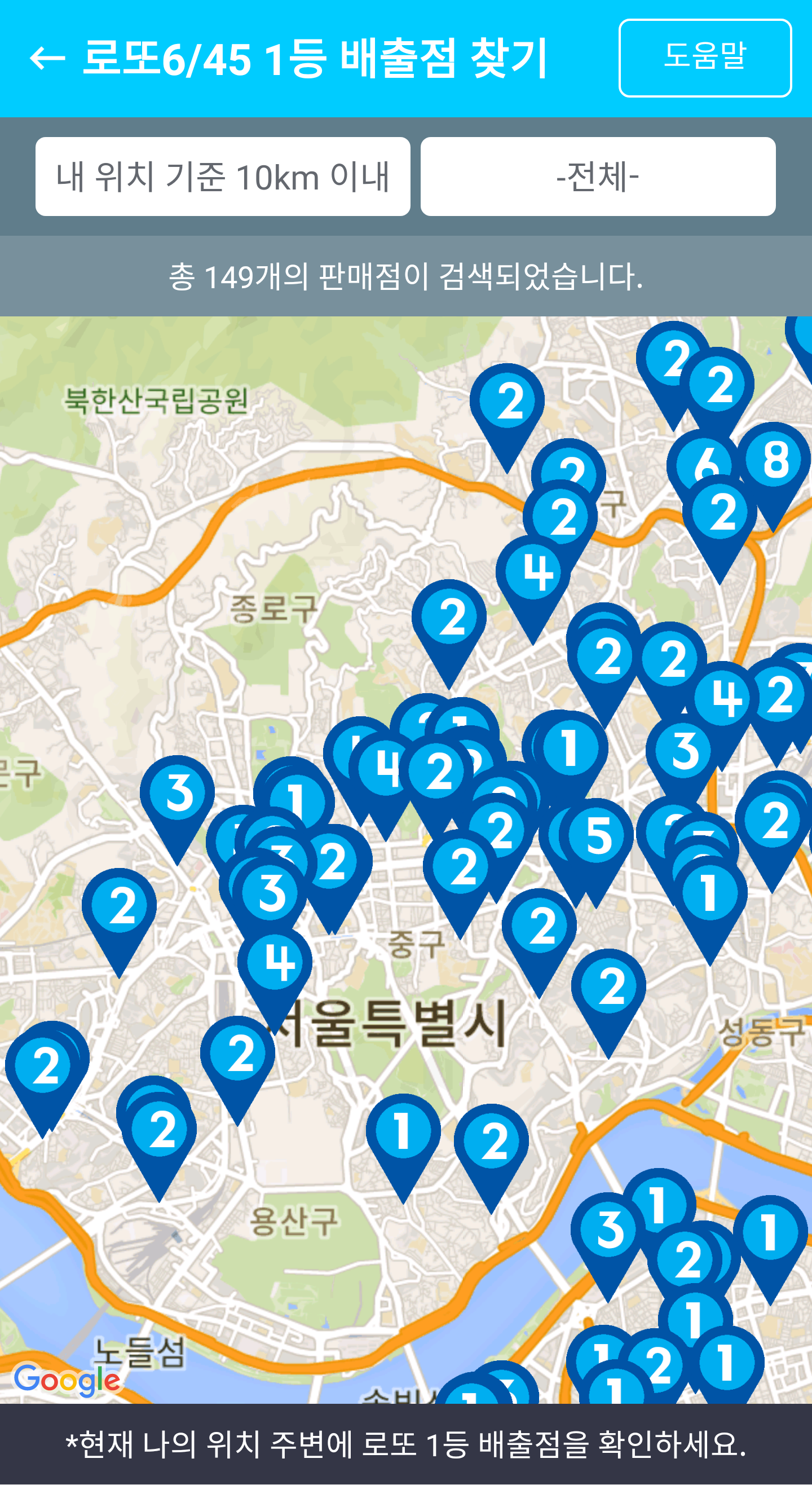 *현재 내 주변에 로또 1등 배출점(판매점) 정보를 지도에 표기하여 제공합니다.