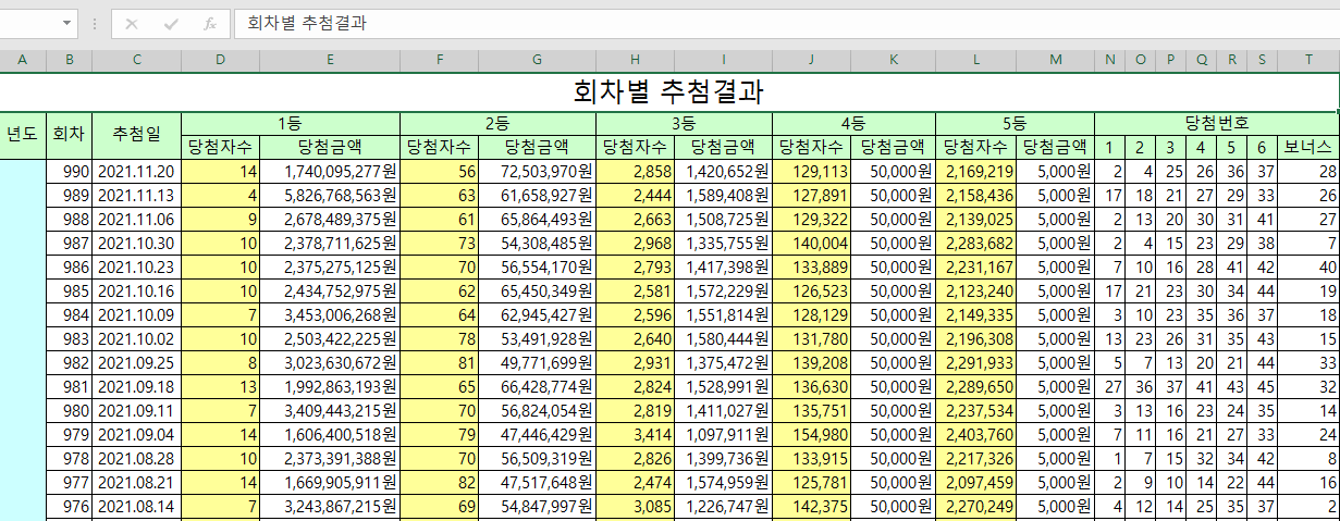 역대 로또 당첨번호 전체 엑셀 파일입니다.