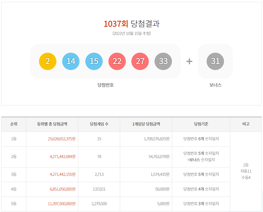• 로또 1등 당첨게임 수 : 15게임 ( 당첨금액 : 1,708,576,825원)