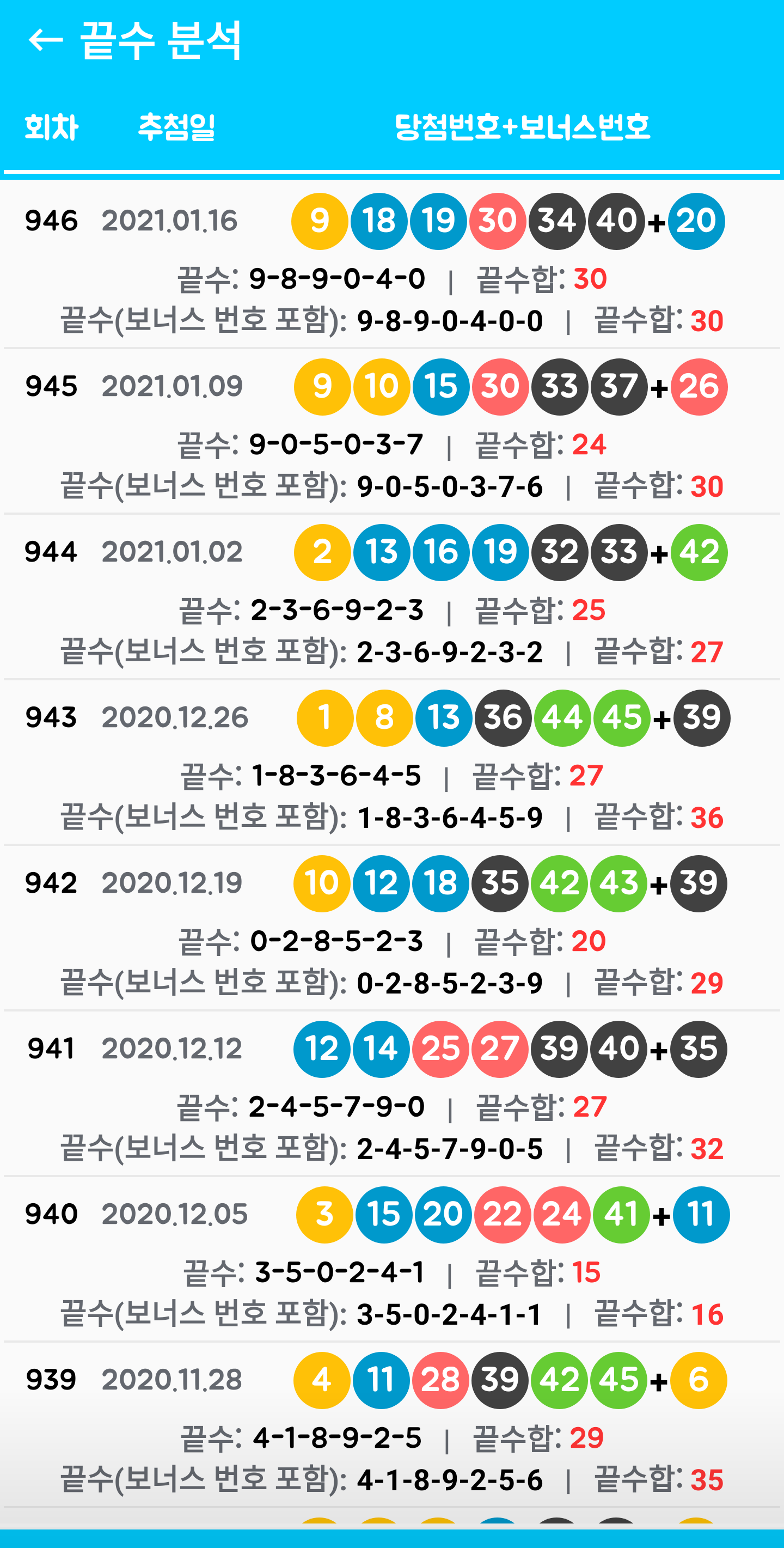 회차별로 당첨 번호릐 끝수를 표기해주고, 끝수합을 제공합니다. 보너스 번호 포함 끝수합도 제공합니다.