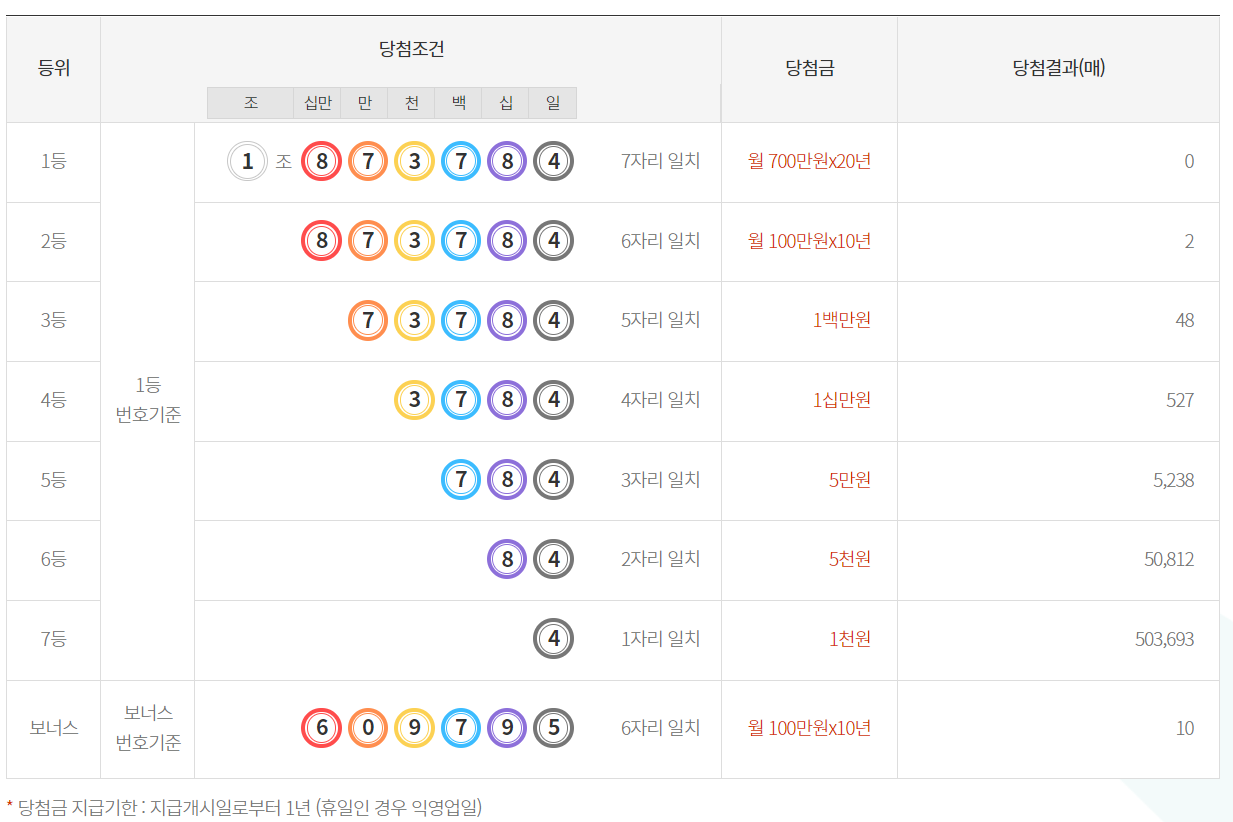 연금복권 1등 2등 3등 4등 5등 6등 7등 당첨 번호 확인