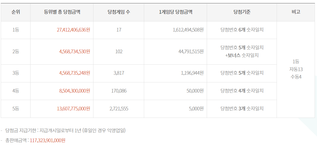2등 : 당첨번호 5개 숫자일치 + 보너스 숫자일치