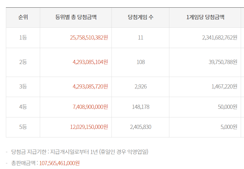 등수별 당첨 게임 수 및 당첨 금액