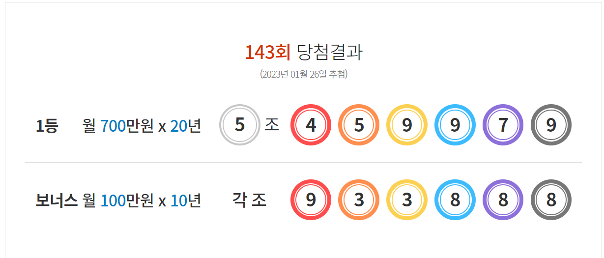 제 143회 연금복권 720 1등 당첨번호는 5조 459979번입니다.