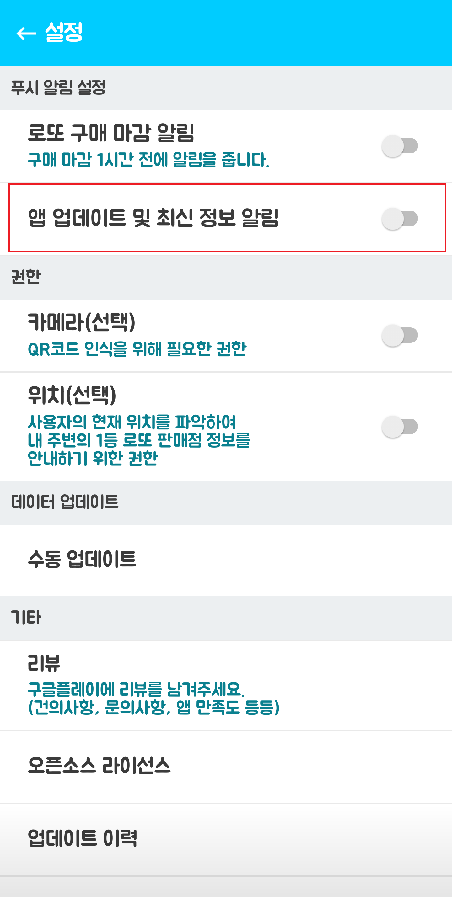 1.설정메뉴 > 푸시알림설정 > 앱 업데이트 및 최신 정보 알림 구독 기능을 추가하였습니다. 이 기능을 활성화 하시면 앱 업데이트 알림 및 뉴스 정보, 로또 구매 마감 등의 정보를 푸시알림으로 알려드립니다.
