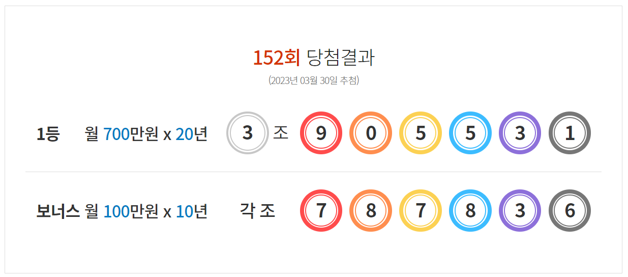 제 152회 연금복권 720 1등 당첨번호는 3조 905531번입니다.