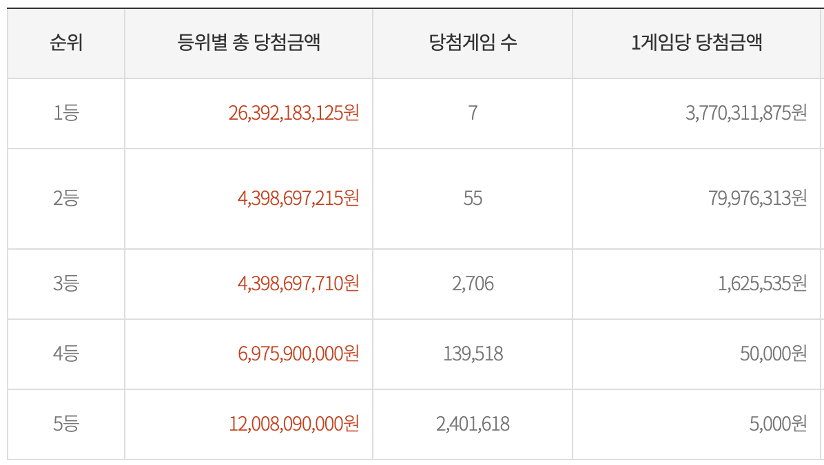 2등 : 당첨번호 5개 숫자일치 + 보너스 숫자일치
