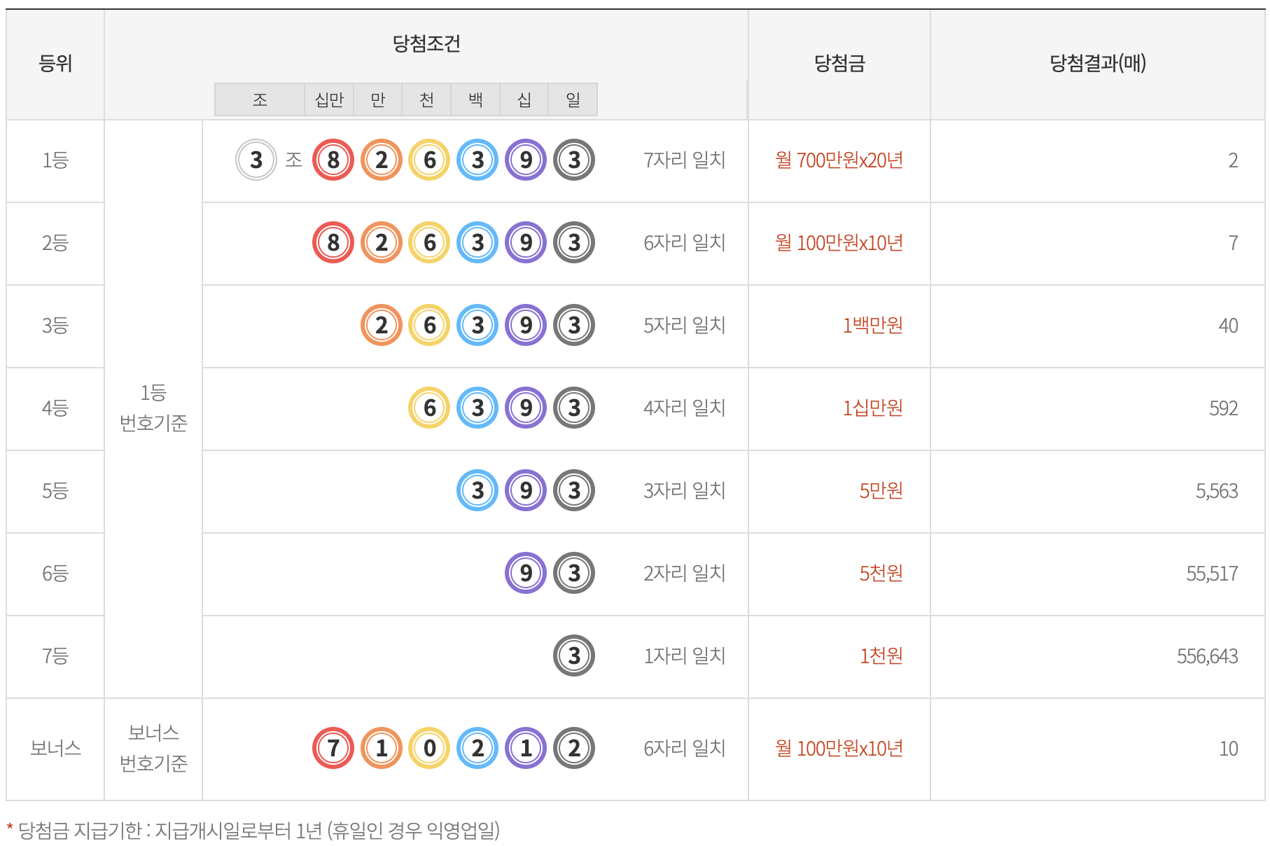 - 연금복권 720+당첨금은 등수별로 중복되는 경우에도 모두 수령 가능하며, 지급 개시일로부터 1년이며, 휴일인 경우 익영업일입니다.