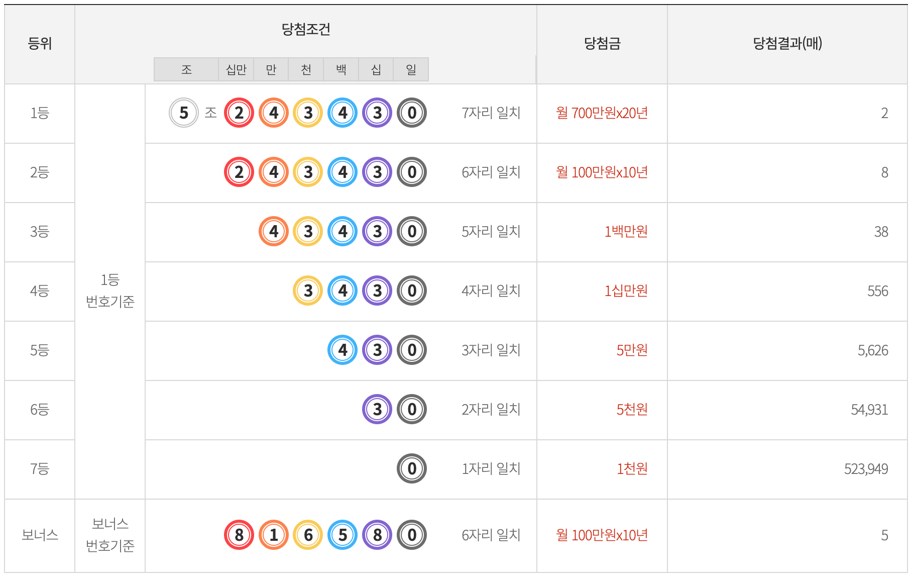 제 157 연금복권 720 1등 당첨번호는 5조 243430번입니다.