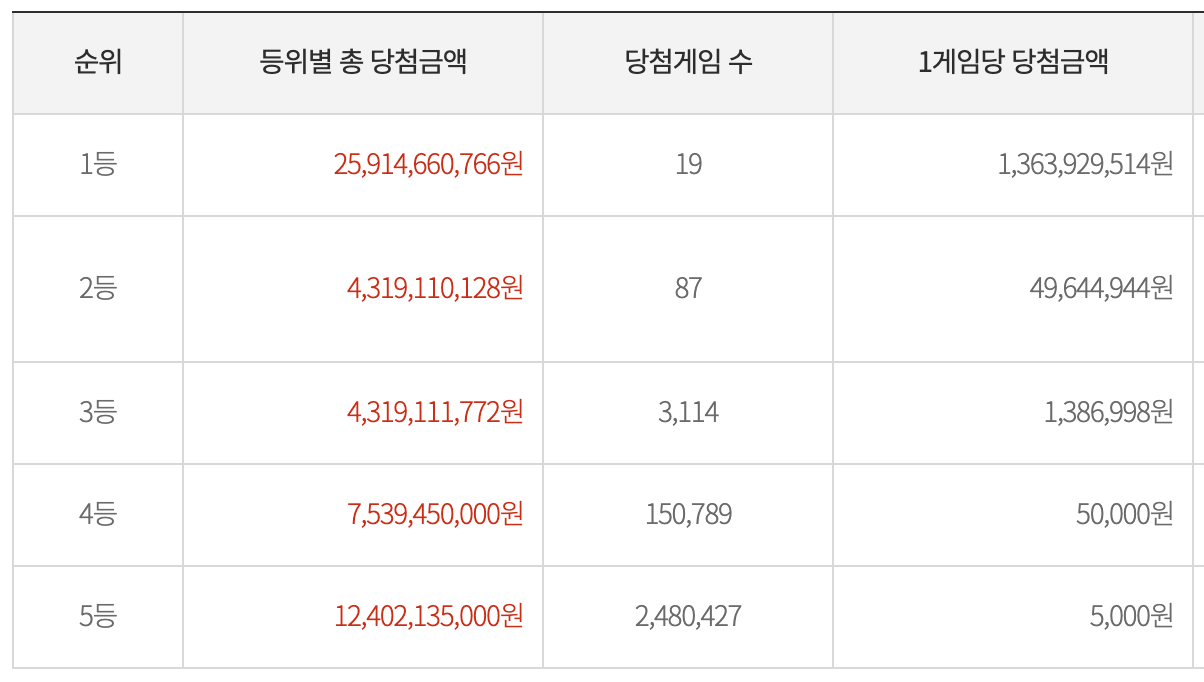등수별 당첨 게임 수 및 당첨 금액