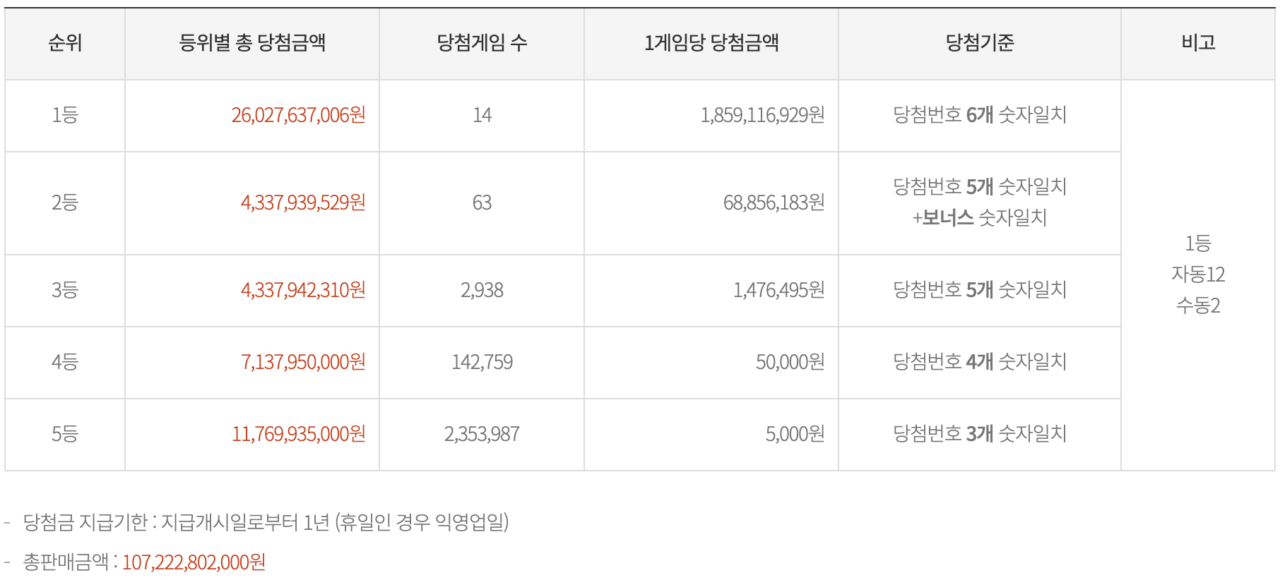 등수별 당첨 게임 수 및 당첨 금액