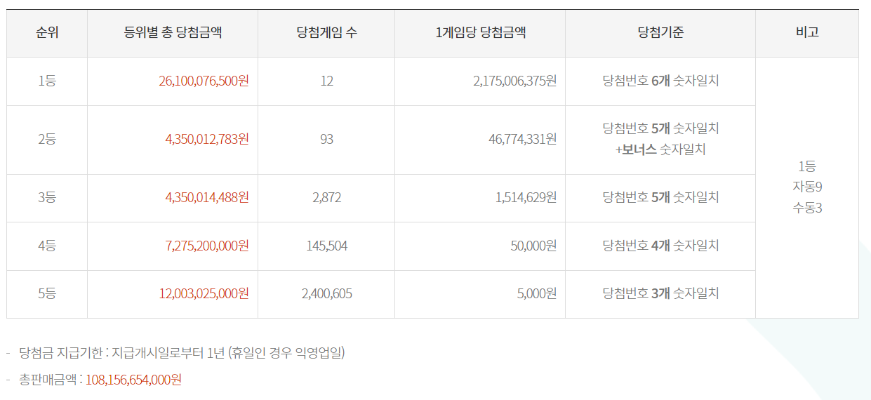 로또 1072회 당첨 게임 수 및 당첨 금액