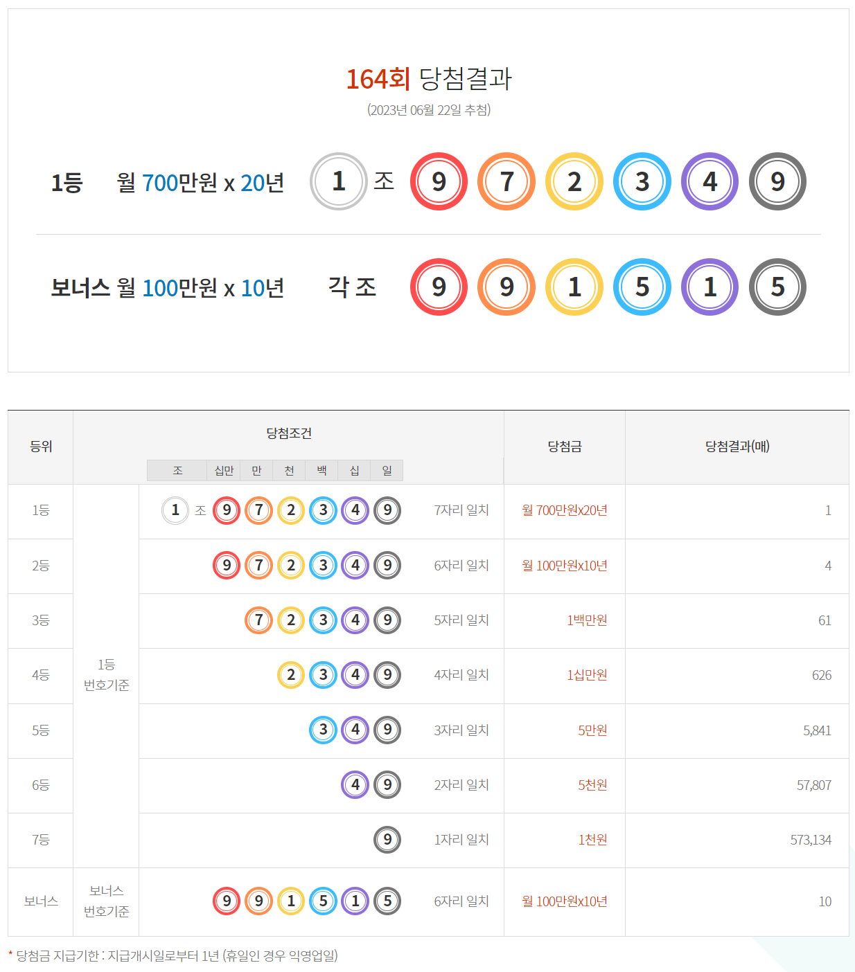 - 연금복권 720+당첨금은 등수별로 중복되는 경우에도 모두 수령 가능하며, 지급 개시일로부터 1년이며, 휴일인 경우 익영업일입니다.