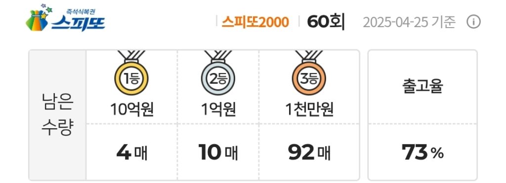 스피또2000 즉석복권 60회 남은수량 1등 4매(총 6매 중), 2등 10매(총 18매 중), 3등 92매(총 150매 중)가 남아있습니다. 출고율(판매점 입고율)은 73%입니다.