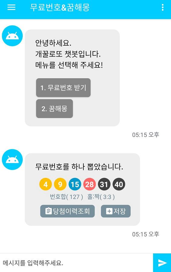 다른 한 게임은 개꿀로또 챗봇으로 부터 무료번호를 받아서 합니다.