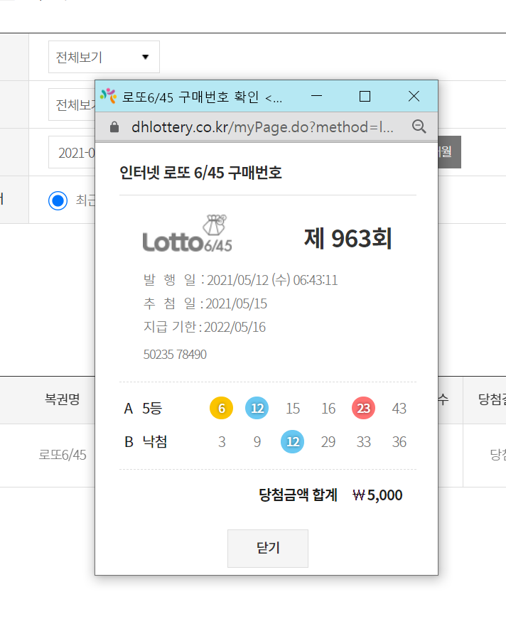 지난주 963회차에서는 개꿀로또에서 제공받은 무료번호가 로또 5등에 당첨되었네요.ㅎㅎ