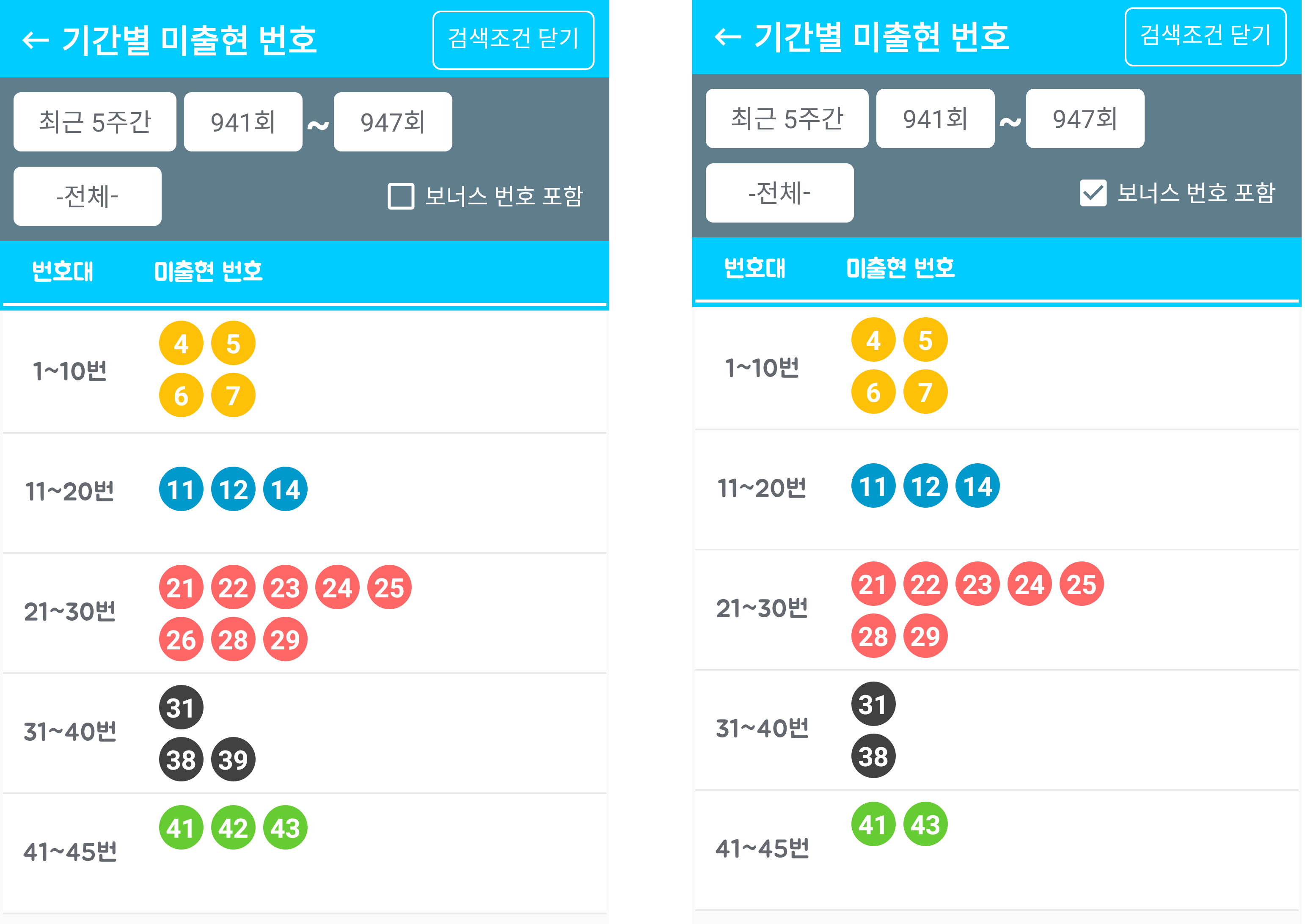 - 41~45번 번호대 에서는 미출현 번호가 없습니다.