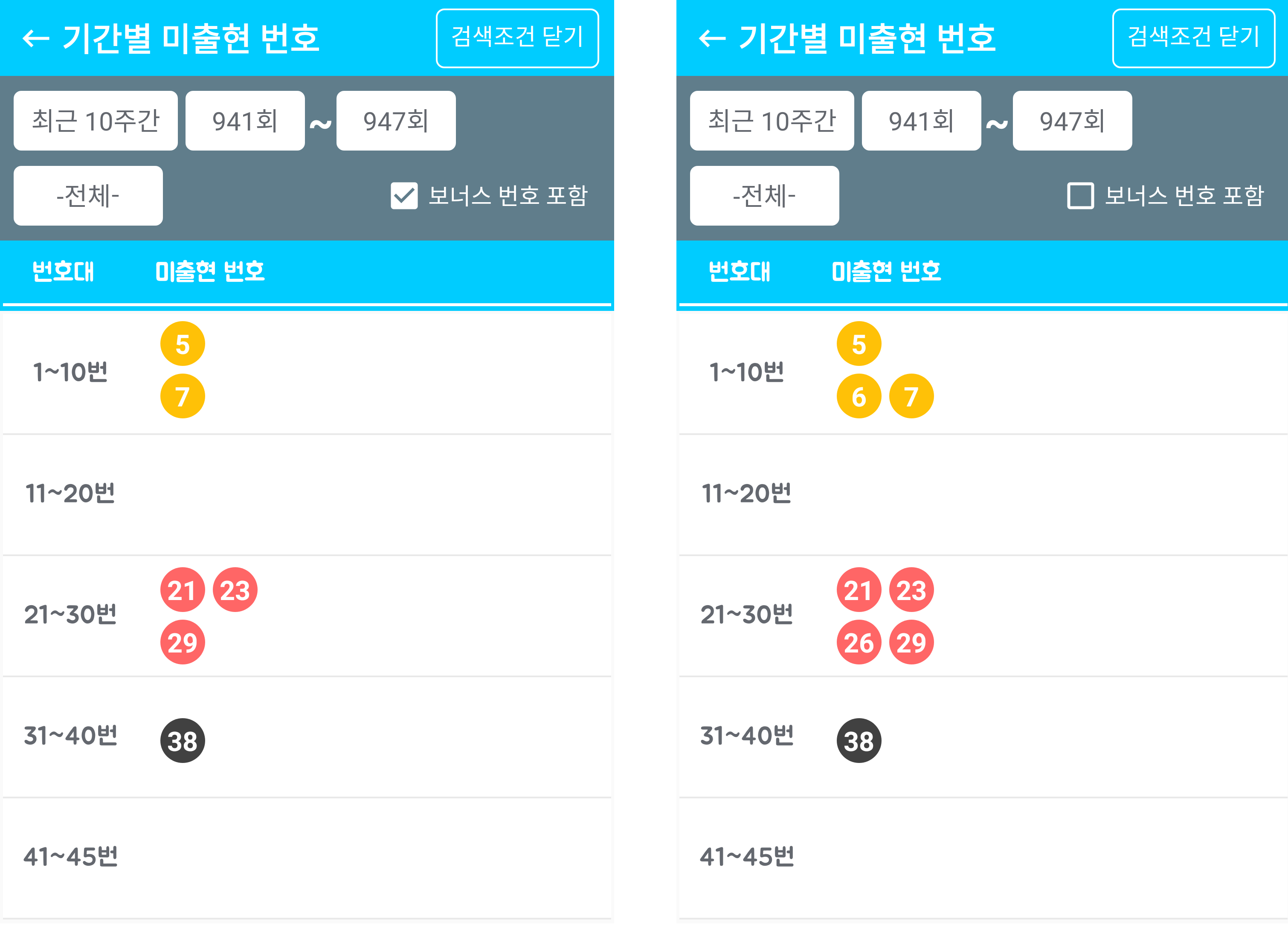 - 21~30번 번호대 에서는 21, 22, 23, 24, 25, 28, 29번이 미출현하였습니다.