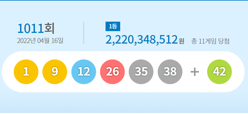 - 로또 1등 당첨게임 수 : 11게임 ( 당첨금액 : 2,220,348,512원)