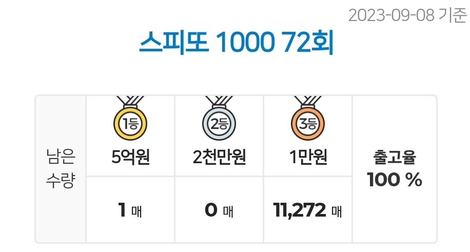 - 스피또1000 72회 1등 남은 수량 및 출고율 (2023.09.08 기준)