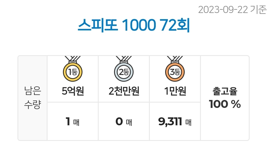 스피또1000 72회 1등 남은 수량 및 출고율 정보 및 당첨현황 정보입니다.(2023년 9월 22일 기준)