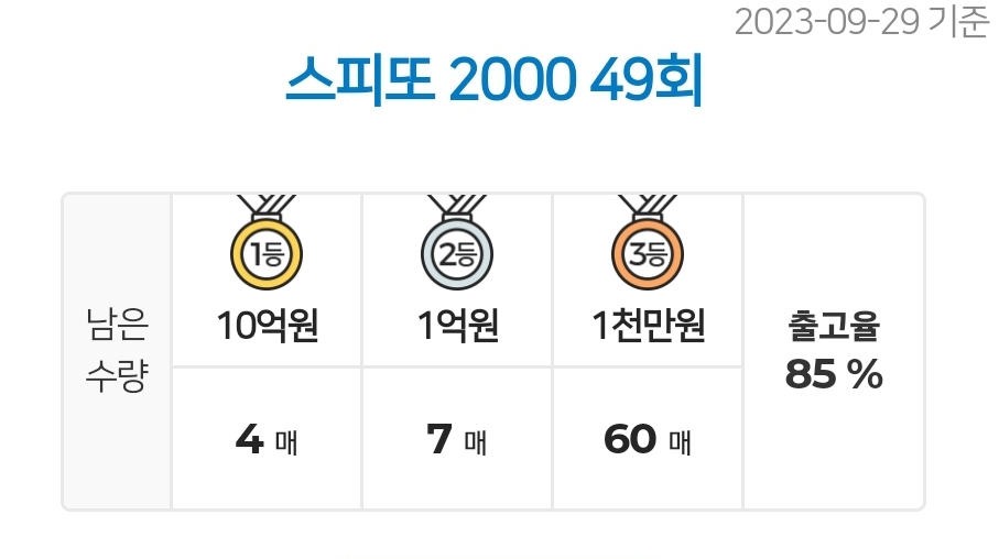 - 스피또2000 49회 출고율 / 스피또2000 49회 당첨현황(2023.09.29 기준)