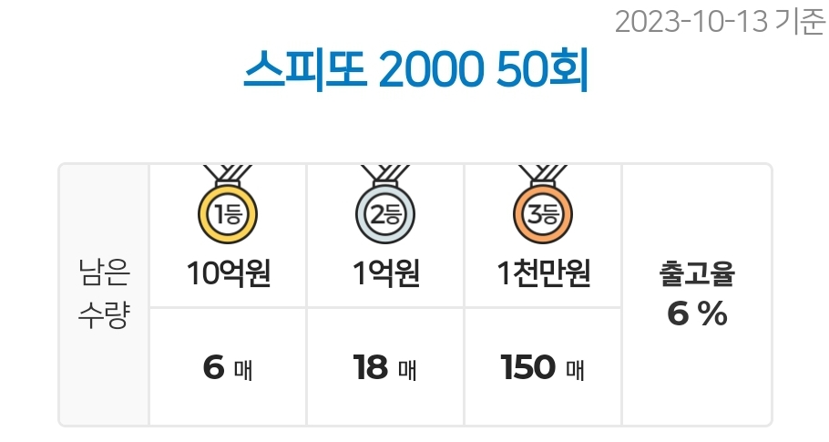 - 스피또2000 50회 출고율 / 스피또2000 50회 당첨현황(2023.10.13 기준)