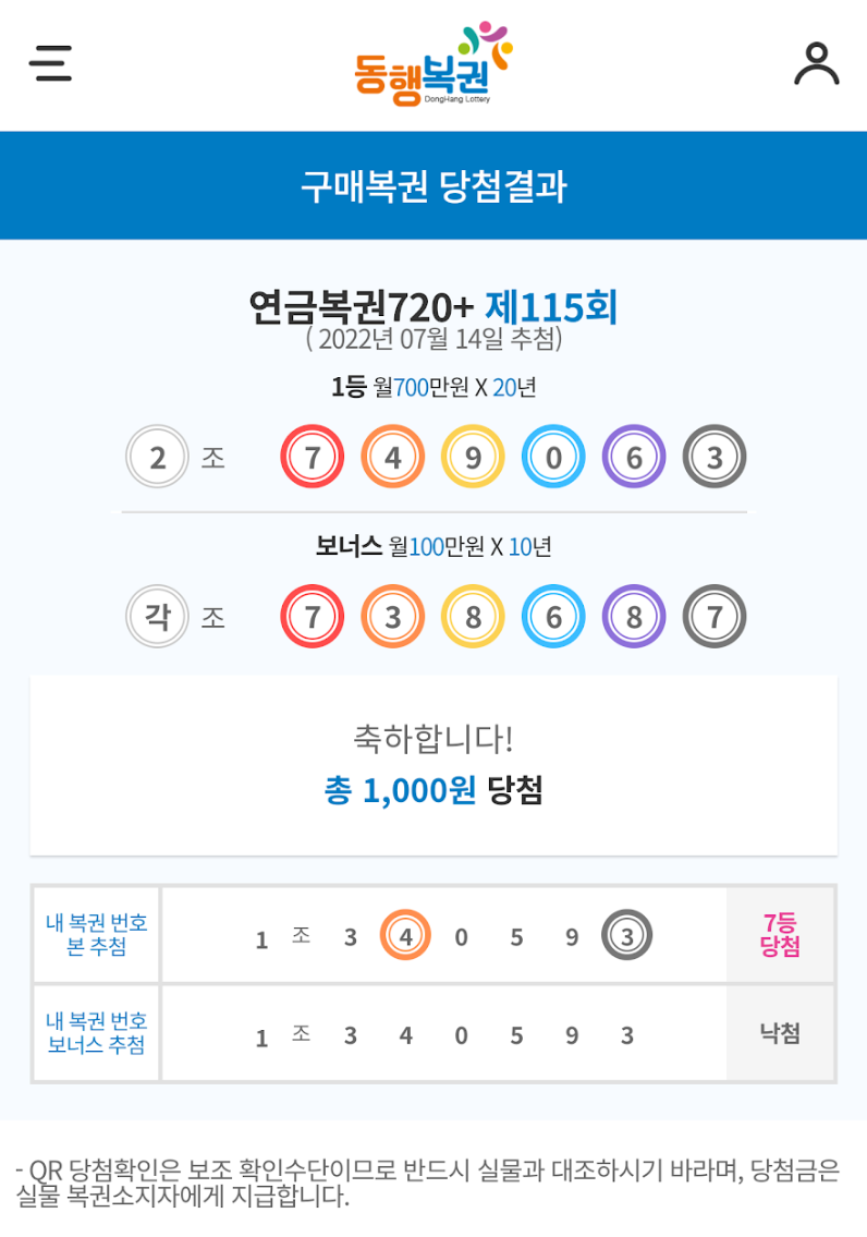 태어나서 처음으로 연금복권에 당첨 되었습니다.