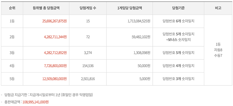 로또 1083회 당첨 게임 수 및 당첨 금액